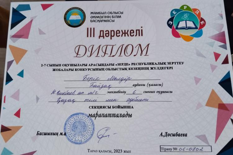 Ағымдағы жылдың 31 қазан күні Жамбыл облысы әкімдігінің білім басқармасының «Жамбыл дарыны» аймақтық ғылыми-практикалық орталығының ұйымдастыруымен 2-7 сынып оқушыларына арналған республикалық «Зерде» зерттеу жобалары конкурсынының облыстық кезеңі өтті. Мектеп-гимназияның 6 "А" сынып оқушысы Берік Мөлдір қатысып, III дәрежелі дипломмен малапатталды.